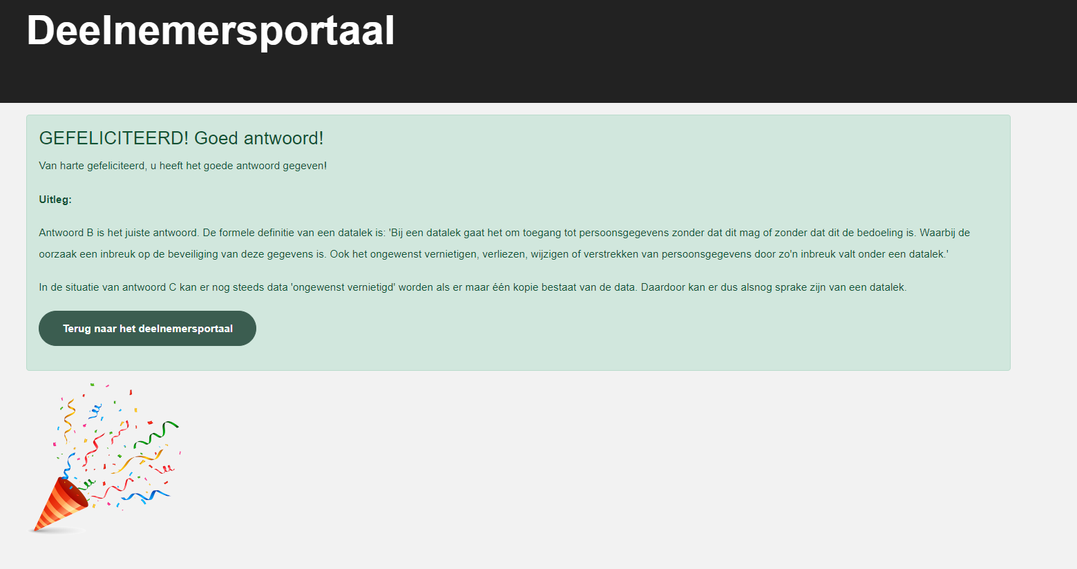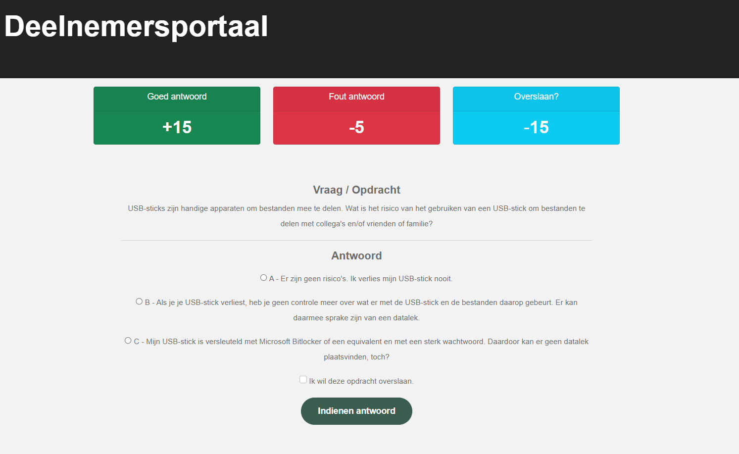 Nadat u op de inloglink geklikt hebt die u van de Gamemaster heeft gekregen, komt u in het deelnemersportaal terecht. Op deze pagina ziet u hoeveel vragen er zijn, welke vragen u al beantwoord heeft, hoeveel punten er zijn behaald en hoeveel pogingen u heeft gedaan om de vraag succesvol te beantwoorden of over te slaan.