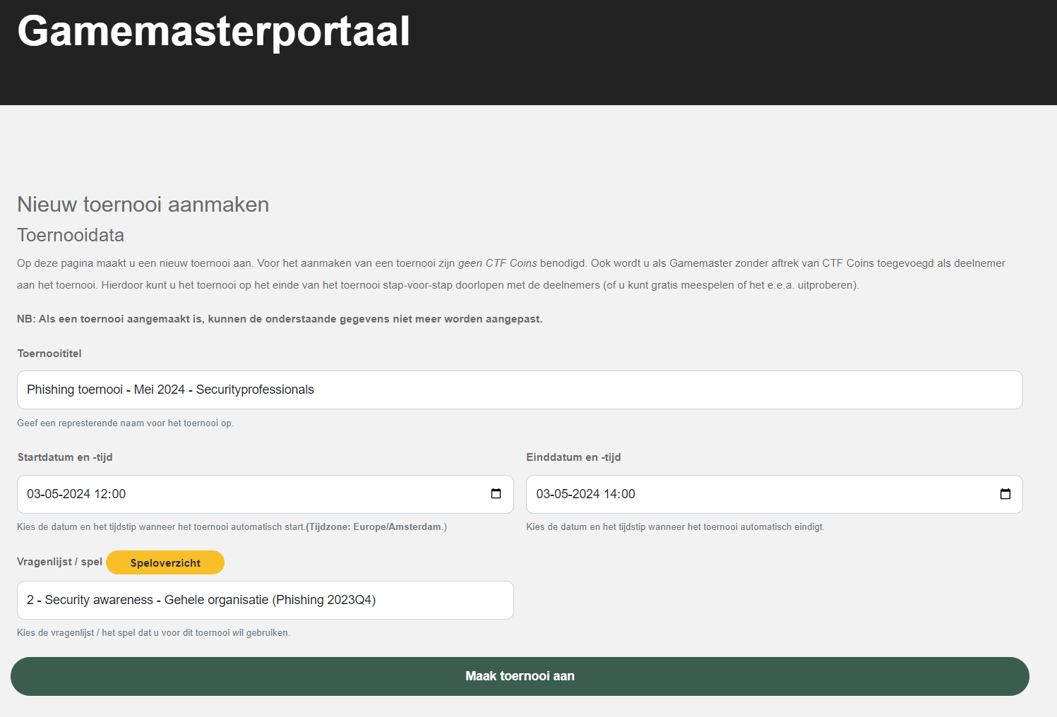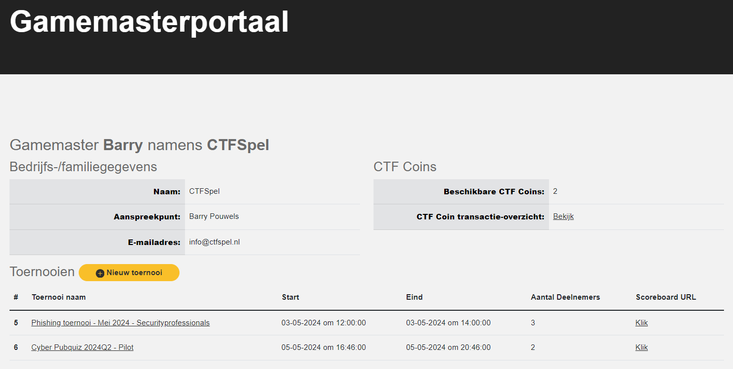 Nadat u bent ingelogd als Gamemaster, komt u terecht in het Gamemasterportaal. In dit portaal vindt u alle toernooien die voor uw organisatie zijn aangemaakt. Daarnaast kunt u vanaf hier een nieuw toernooi aanmaken en direct zien hoeveel CTF Coins u nog tot uw beschikking heeft.