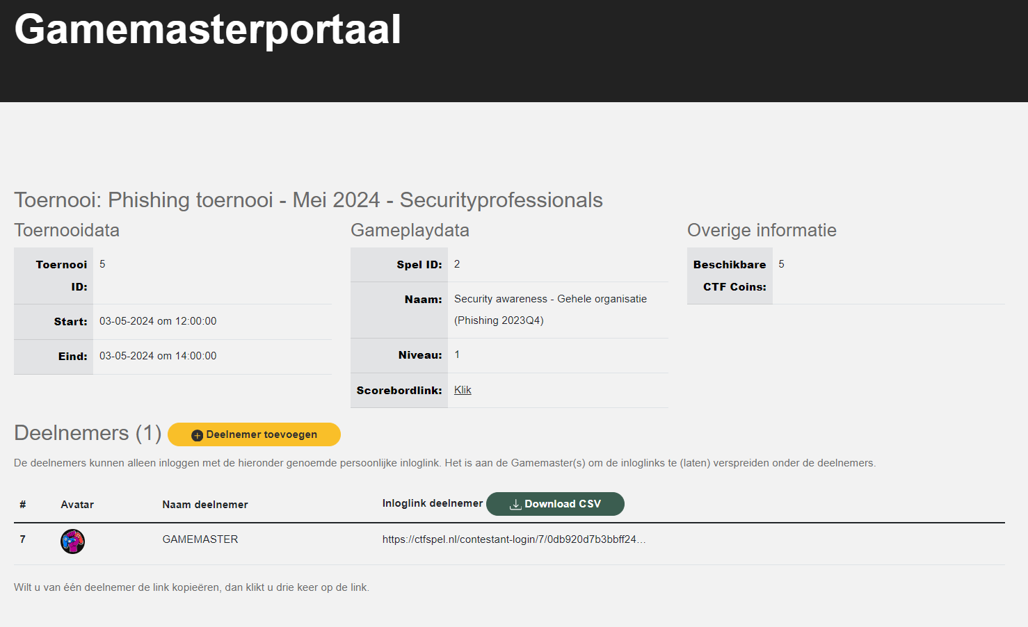 Naast het opzetten en het beheren van een spel, zorgt de Gamemaster er ook voor dat alle deelnemers een unieke inloglink krijgen om het spel te spelen.