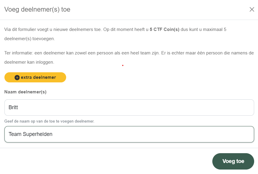 U kunt meer deelnemers tegelijk toevoegen door op de knop 'Extra deelnemer' te drukken. Let op: u kunt maximaal het aantal beschikbare CTF Coins aan deelnemers toevoegen.