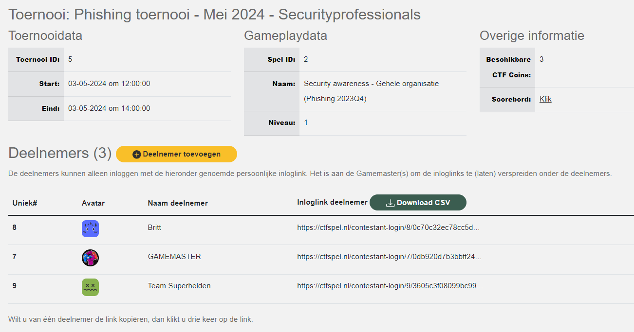 De deelnemers zijn toegevoegd. Per deelnemer is een avatar en een inloglink beschikbaar.