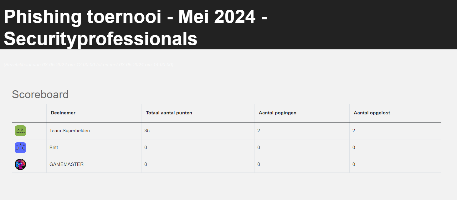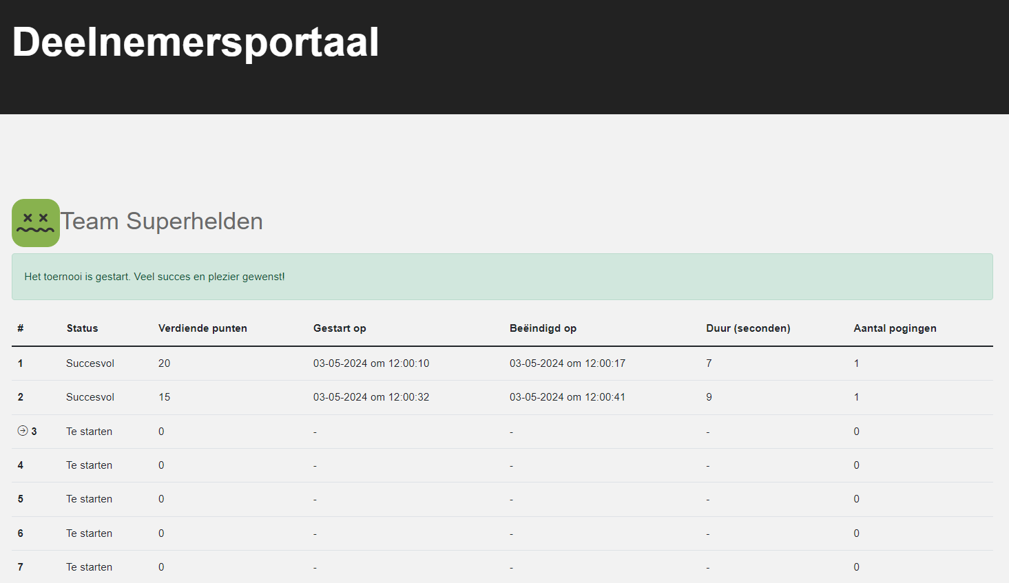 Het toernooi is aangemaakt. U wordt automatisch naar de toernooipagina geleid. Op deze pagina kunt u zien wanneer het toernooi start en eindigt. Tevens vindt u hier een link naar het scoreboard en ziet u alle deelnemers.